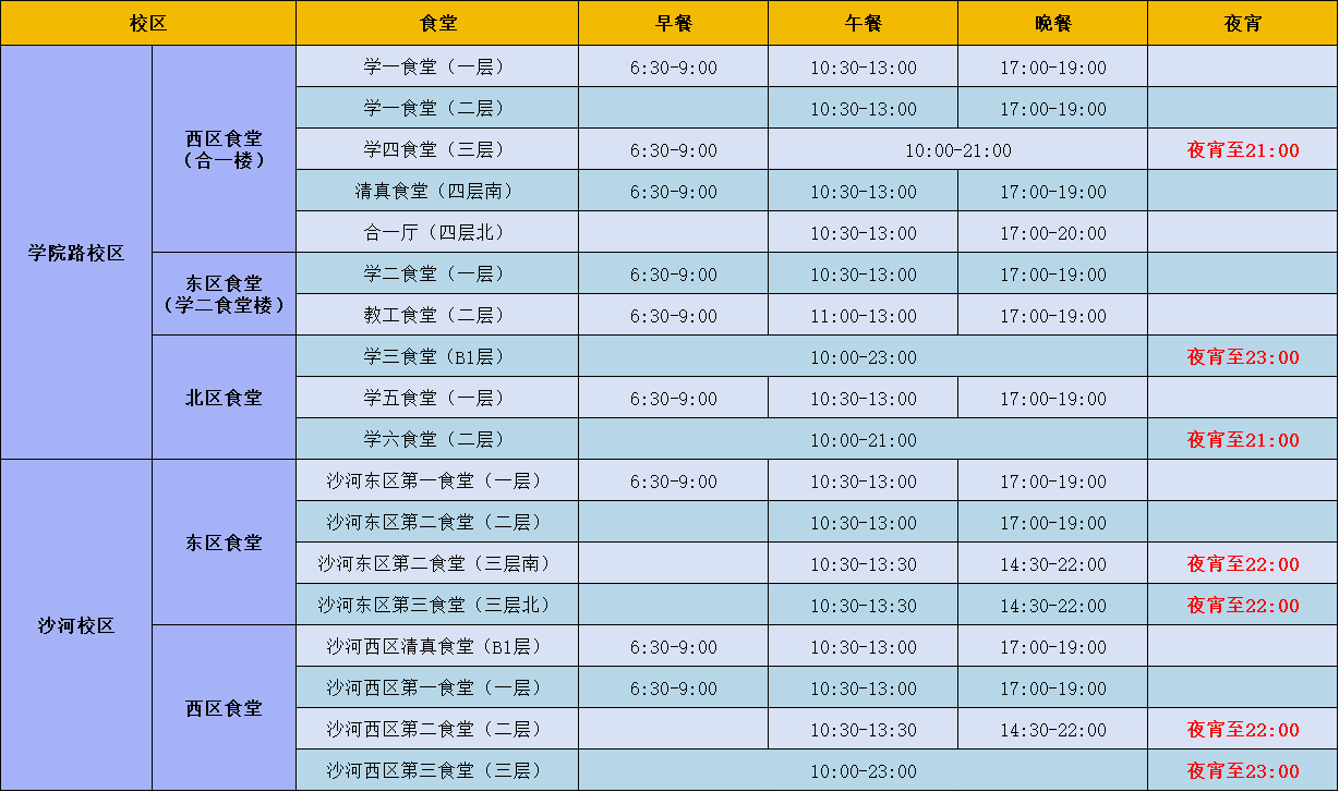 兩校區(qū)食堂營業(yè)時間表:
