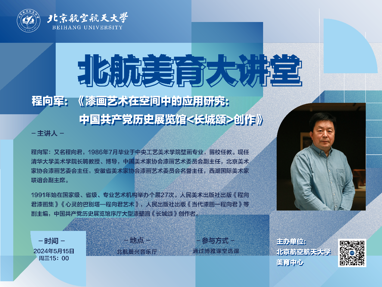 中國共產黨歷史展覽館序廳的巨幅漆壁畫《長城頌》寬40米,高15米,總面積600平方米,由100塊漆板組成,是史上最大的室內漆壁畫,寓意建黨百年。由清華大學美術學院程向軍教授設計創作,獲得2020-2021年度建筑材料應用創新類大獎。創作團隊運用有效的工藝處理,使漆材料肌理與啞光工藝處理達到了理想視覺效果,觀眾可以無盲區地欣賞壁畫,這幅世界上最大的漆壁畫已經成為這座紅色新地標的藝術名片。講座通過中國共產黨歷史展覽館《長城頌》創作,講述漆畫藝術在空間中的應用研究。