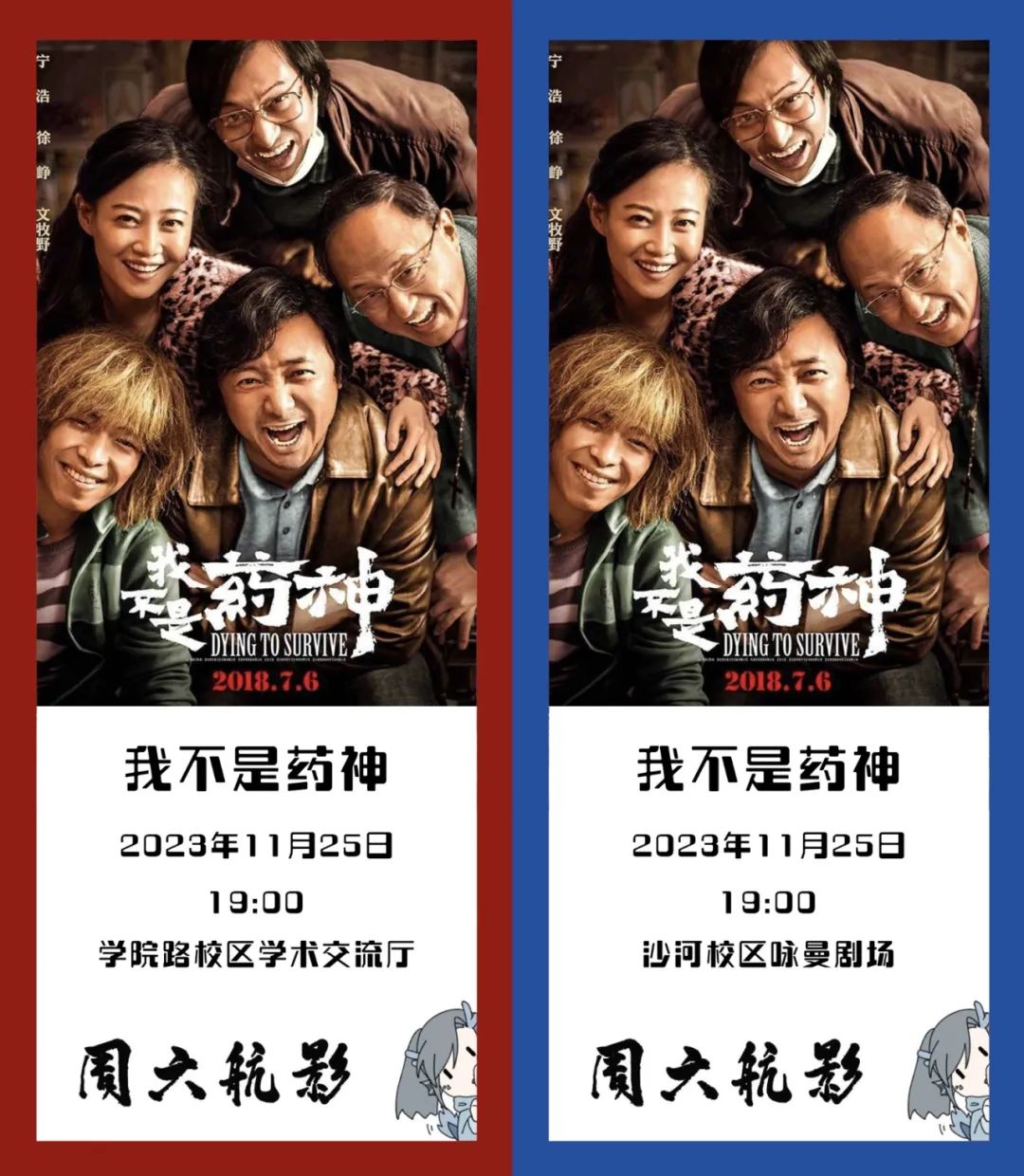 11月25日(周六)19:00,《我不是藥神》將于學(xué)院路校區(qū)學(xué)術(shù)交流廳和沙河校區(qū)詠曼劇場同步放映。