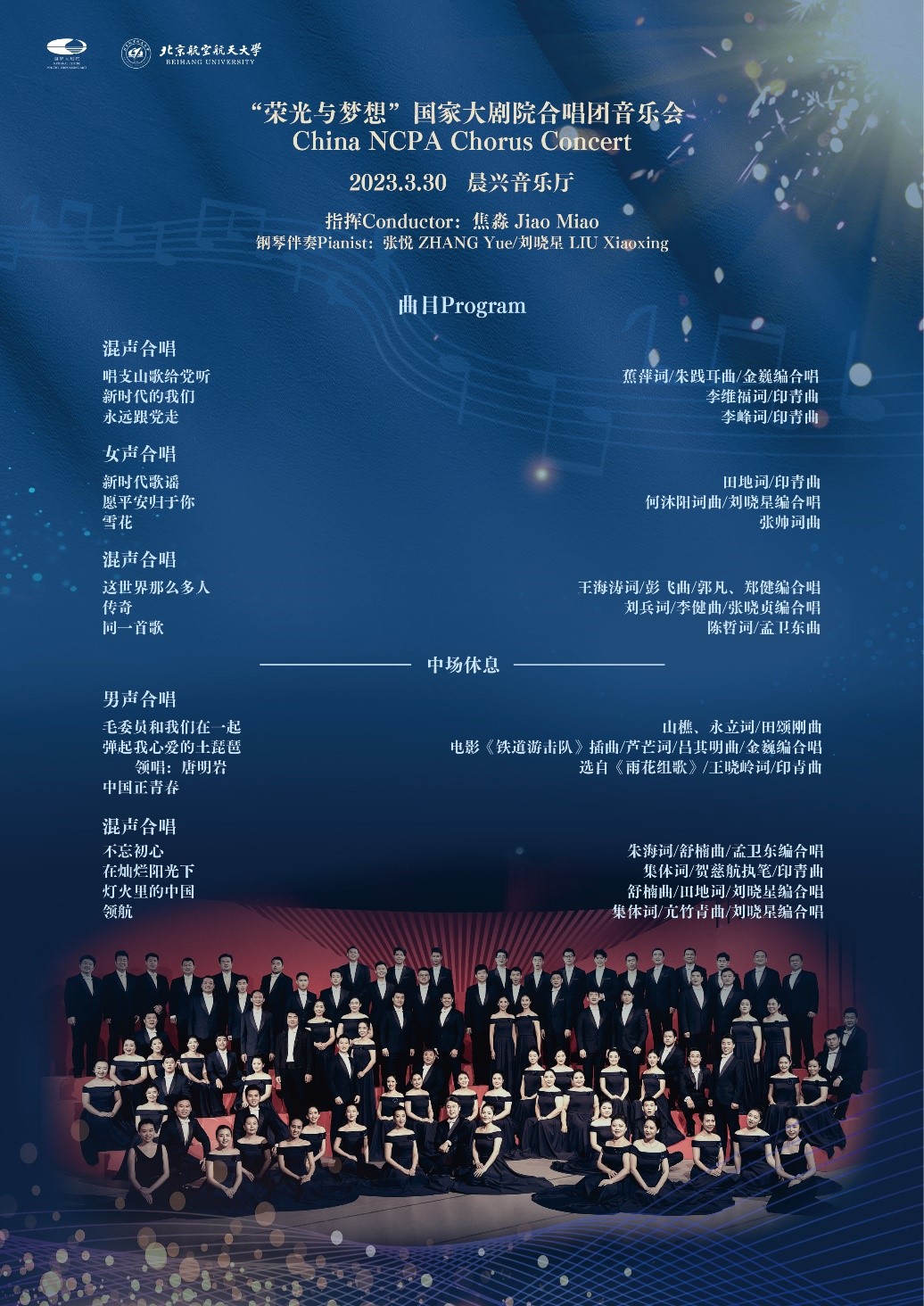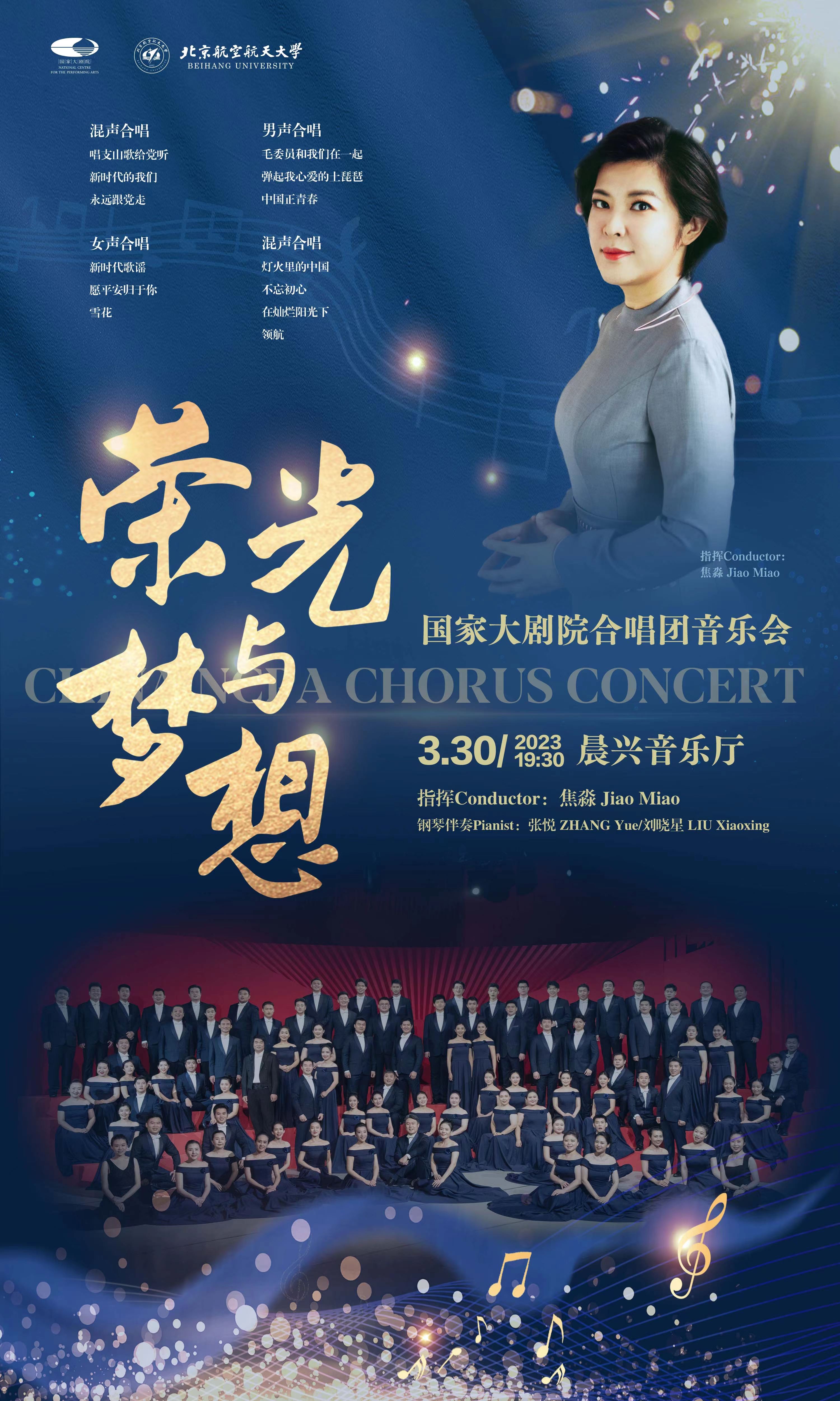 3月30日(周四)19:30,駐團(tuán)指揮焦淼攜手國(guó)家大劇院合唱團(tuán)在北航學(xué)院路校區(qū)晨興音樂廳為師生帶來一場(chǎng)關(guān)于“榮光與夢(mèng)想”的盛世歡歌,本場(chǎng)音樂會(huì)既有傳唱紅色經(jīng)典、弘揚(yáng)主旋律的歌曲,更有國(guó)家大劇院合唱團(tuán)全新打造、編創(chuàng)的最新力作,也是新時(shí)代展望未來的文藝新聲。