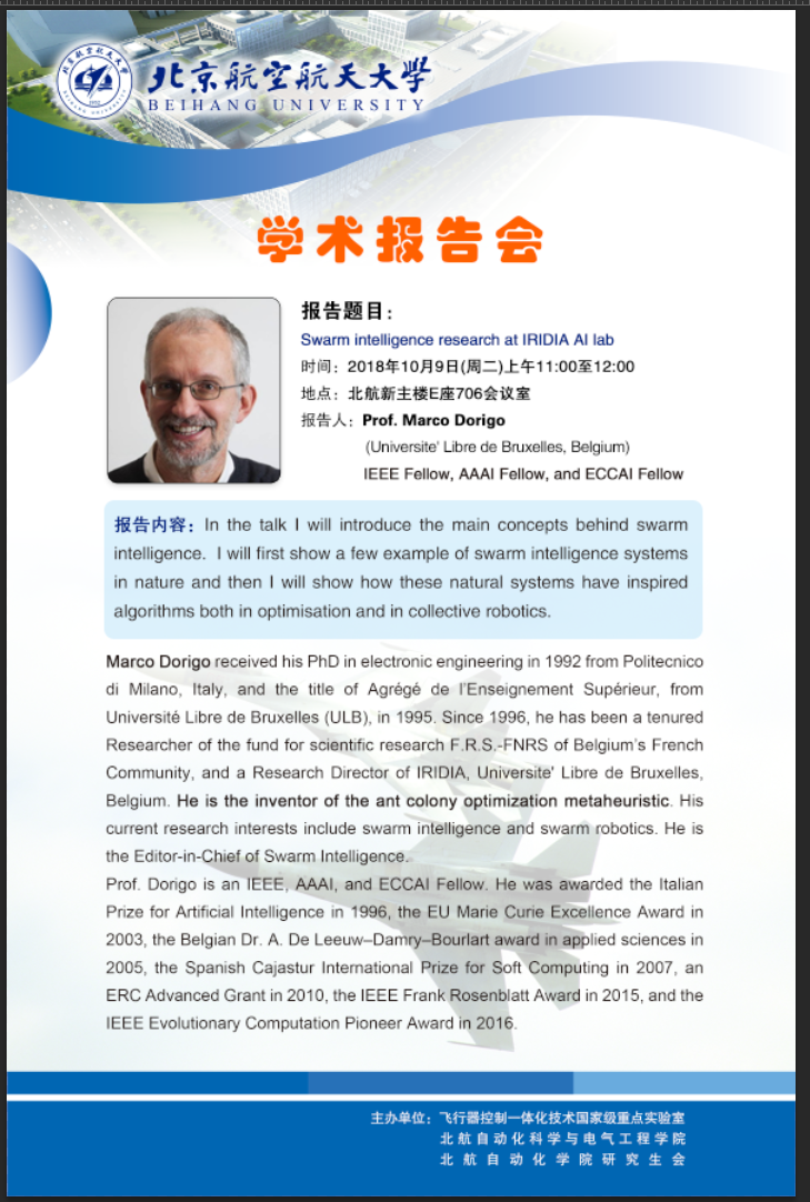報告人:Prof.Marco Dorigo (Universite'Libre de Bruxelles, Belgium)IEEE Fellow,AAAI Fellow, andECCAIFellow