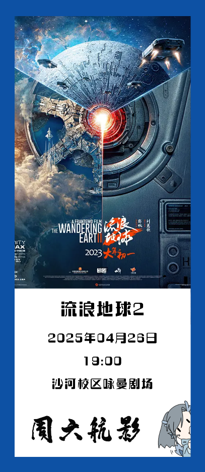 4月26日(周六)19:00 學院路校區學術交流廳,沙河校區詠曼劇場,杭州校區音樂廳,《流浪地球2》同步放映!(無需預約,憑校園卡/校友卡即可入場觀影)
