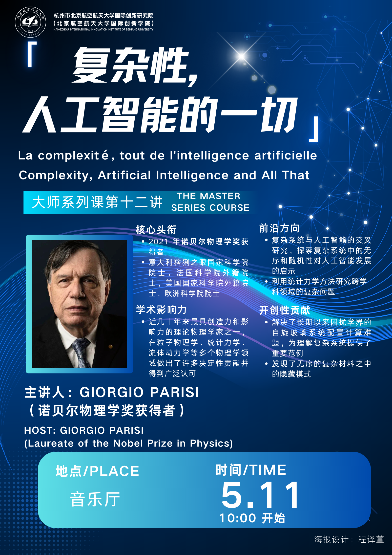 諾貝爾物理學(xué)獎(jiǎng)獎(jiǎng)勵(lì)人類物理學(xué)領(lǐng)域做出突出貢獻(xiàn)的科學(xué)家。Giorgio Parisi(喬治·帕里西)教授發(fā)現(xiàn)了從原子到行星尺度的物理系統(tǒng)中,無(wú)序和波動(dòng)的相互作用,獲得2021年諾貝爾物理學(xué)獎(jiǎng)。5月11日, 教授將做客北航,來(lái)到北航杭州國(guó)際校園,為北航師生帶來(lái)一堂大師課——“復(fù)雜性,人工智能的一切”,京杭兩地三校園將同步直播,歡迎北航師生前往收看。此外,與他一同做客北航的,還有另外兩位著名科學(xué)家,歐洲科學(xué)院院士張駿,歐洲科學(xué)院院士Luciano Pietronero,他們也將帶來(lái)精彩的學(xué)術(shù)講座。