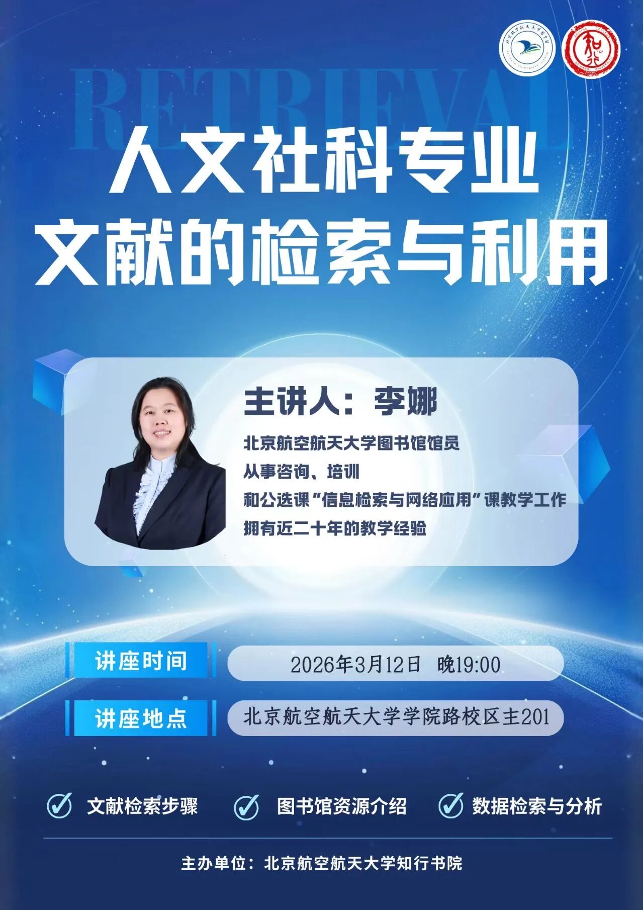 李娜,北京航空航天大學圖書館館員,主要工作是咨詢、培訓和公選課“信息檢索與網絡應用”課教學工作,有近二十年的教學經驗。