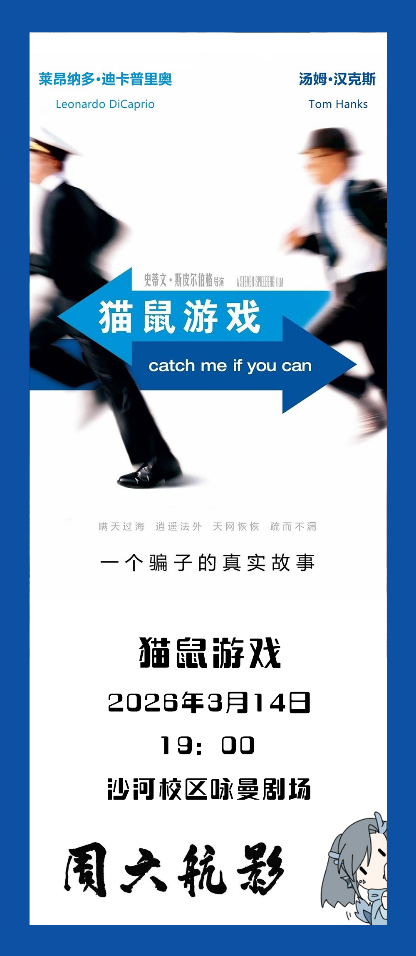 本周「周六航影」,讓我們一起走進《貓鼠游戲》,跟隨弗蘭克的腳步,看一場天才與正義的較量,在貓鼠的追逐中,感受謊言與真誠的碰撞,在荒誕的傳奇里,讀懂成長與救贖的重量。