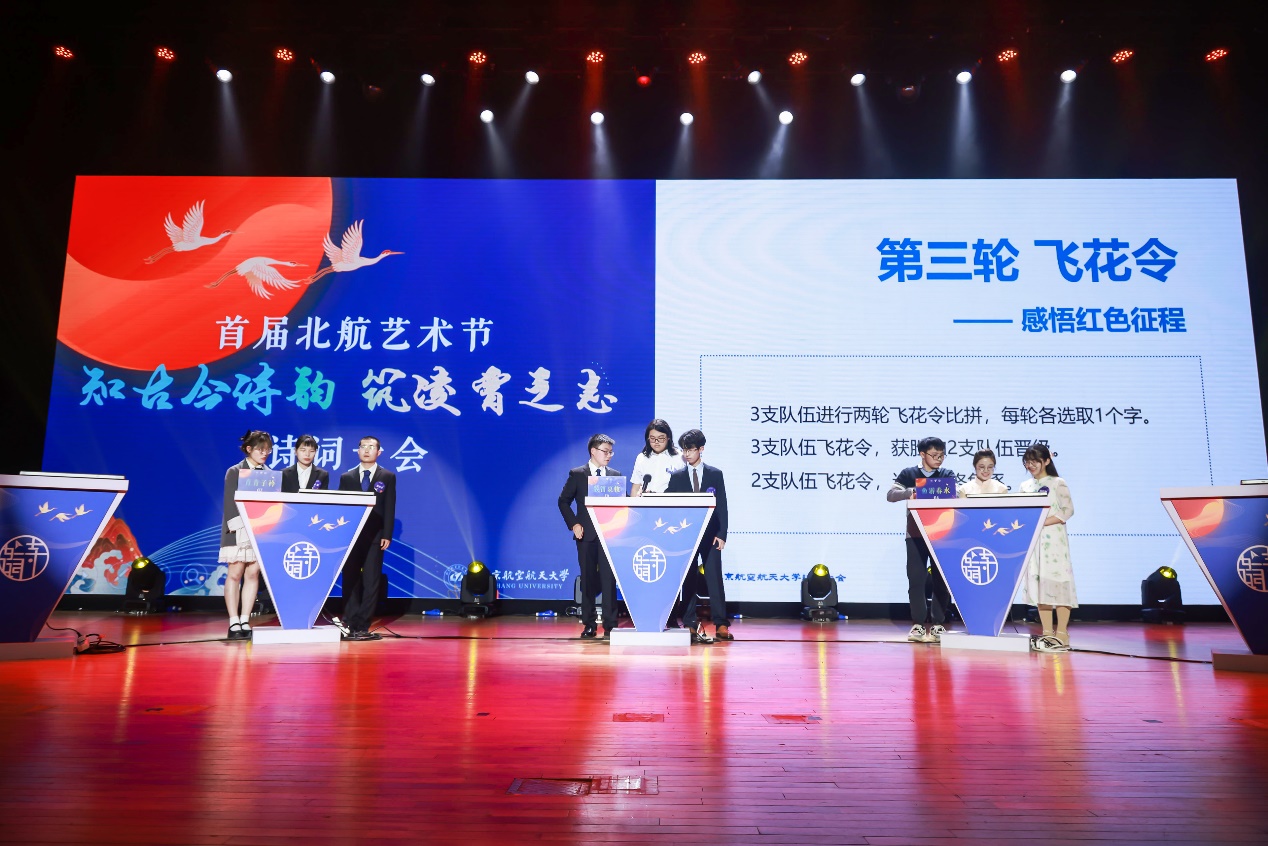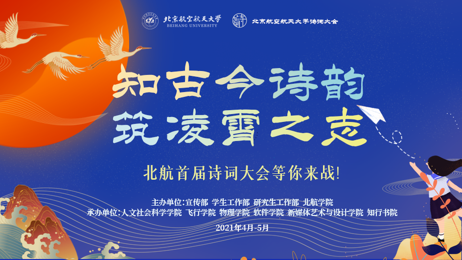 為慶祝中國共產黨成立100周年,引領師生深入學習黨的百年歷史,傳頌紅色經典,弘揚中華優秀傳統文化,傳承空天報國精神,我校于近期舉辦了北京航空航天大學首屆“知古今詩韻,筑凌霄之志”詩詞大會。面向全體北航師生,要求以團隊形式參賽,每隊3人,可跨學院報名,鼓勵師生聯合組隊。本次活動由宣傳部、學生處、研究生院、北航學院主辦,人文社會科學學院、飛行學院、物理學院、軟件學院、新媒體藝術與設計學院、知行書院承辦。