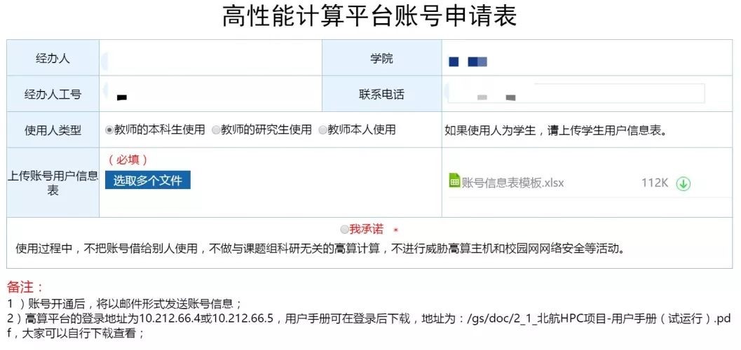 進入OA系統首頁,點擊“新建工作”——“綜合服務”——“高性能計算平臺賬號申請流程”,填寫“高性能計算平臺賬號申請表”