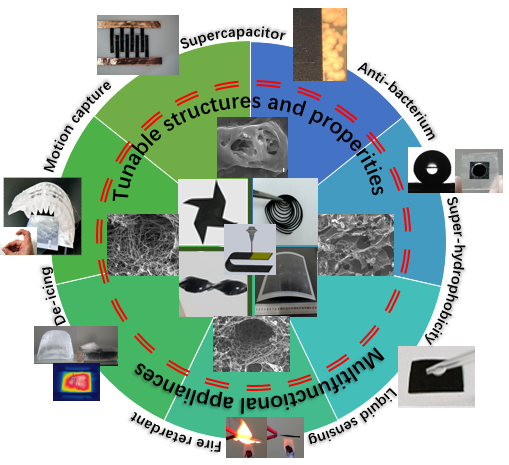 通過(guò)系統(tǒng)的加工結(jié)構(gòu)性能關(guān)系探索研究,該先進(jìn)激光誘導(dǎo)GP材料具備優(yōu)異的力學(xué)、電學(xué)、熱學(xué)、電化學(xué)等特性,可用于可穿戴手勢(shì)識(shí)別、機(jī)器人動(dòng)作捕捉、油水分離、抗菌界面以及實(shí)現(xiàn)具有阻燃、防/除冰、結(jié)構(gòu)健康監(jiān)測(cè)等功能的先進(jìn)航空樹(shù)脂基復(fù)合材料結(jié)構(gòu),未來(lái)具有廣闊的商業(yè)化前景。