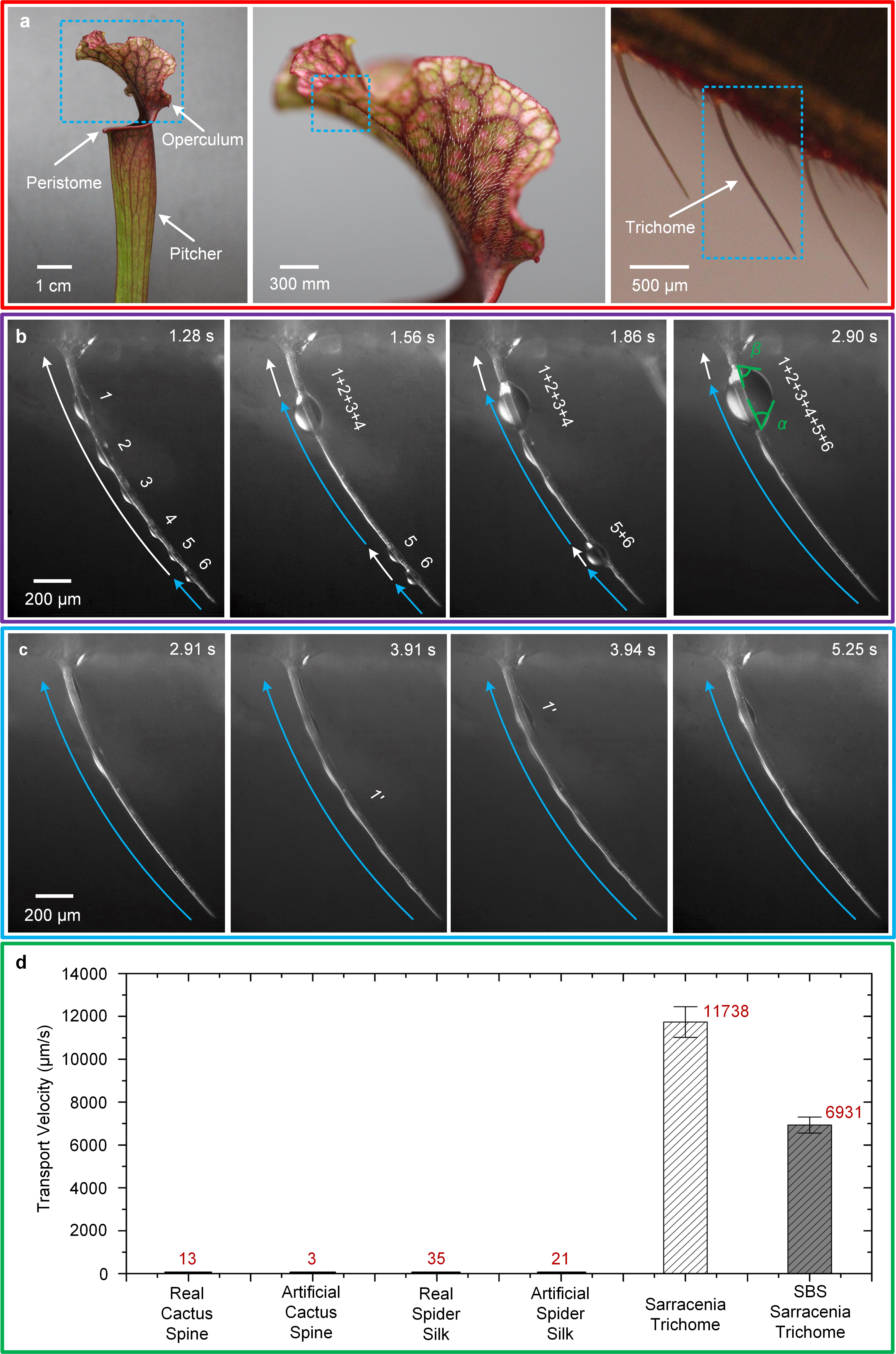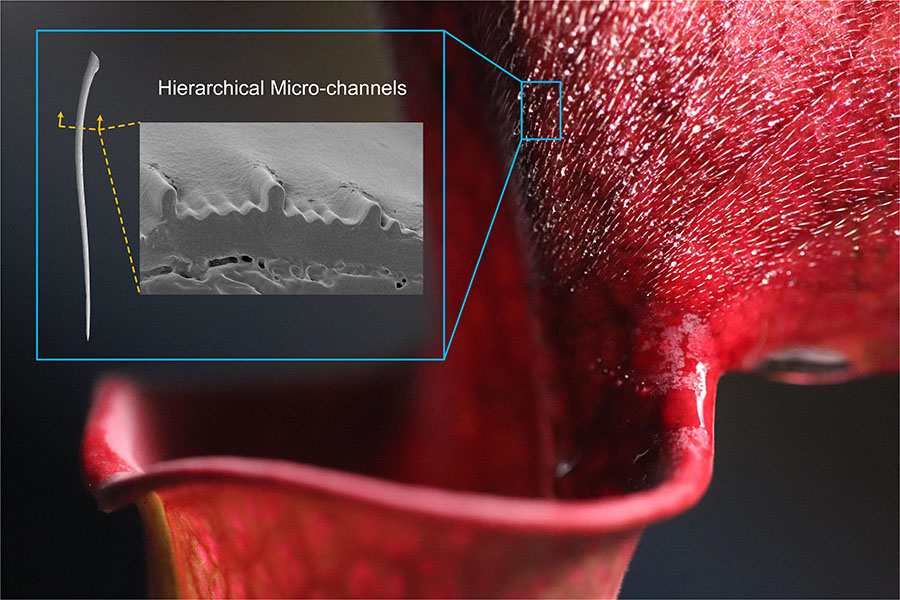 在對瓶子草表面微結構的觀察基礎上,團隊深入分析了絨毛的表面微觀結構特征,首次發現了特殊的高低棱多級微納溝槽結構,液體也在表面干濕狀態下會相繼出現兩種不同的輸送模式。這種特殊高低棱多級溝槽結構導致的兩種連續而又不一樣的輸水模式會首先在矮棱構成的底部溝槽中快速形成一薄層水膜,后續液滴就可在這層水膜上超快速滑動,輸送模式在干、濕狀態下會發生明顯轉變。用陳教授的話來說,“有一種‘后浪推前浪’的效果”。