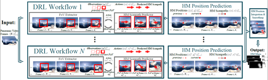 在對熱點圖分析后,團隊發現,盡管不同的人觀看同一內容時感知區域存在一定差異,但與視頻內容依然具有強關聯性。基于此,可構建預測模型,預測人類觀看全景視頻時的頭動位置。而這種模型的構建機理,又與強化學習方法有本質上的聯系。因此,他們提出一種新型的深度強化學習(DRL)模型,構建智能體模擬人類行為,預測人類觀看全景視頻時的頭部運動。首次提出全景視頻視場熱點圖的生成方法,可離線地預測全景視頻視場,并提出一種全景視頻的在線生成方法,可在線實時預測全景視頻視場。最后,實驗結果驗證:與傳統算法相比,論文提出的算法所預測視野熱點圖,CC(和真實結果的相關系數)精度提升超過20%。論文對全景視頻的壓縮,渲染,感知,有著廣泛的應用場景,為提升全景視頻用戶體驗提供了理論支撐。