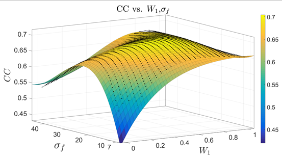 圖4.對中心偏見取不同標準差和權重系數下預測結果的CC值擬合曲面