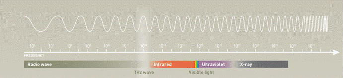 太赫茲電磁輻射波長位于微波與遠紅外光之間,頻率范圍覆蓋0.1-30THz,,又被稱為亞毫米波,是電磁波譜上還未被人類深入研究和開發(fā),但極具學(xué)術(shù)價值和重要應(yīng)用的一個頻段。太赫茲波又被稱為“生命射線”,不僅因為其特殊頻段包含生命分子DNA和蛋白質(zhì)的集體振動頻率,還因為占人體70%的水所具有的氫鍵網(wǎng)絡(luò)的動態(tài)時間也在皮秒量級(皮秒的倒數(shù)即為太赫茲)。