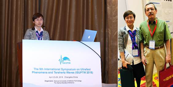 圖:(左圖)吳曉君副教授在第九屆超快現(xiàn)象與太赫茲國際會議上展示最新成果 (右圖)吳曉君副教授與傾斜波前技術(shù)的發(fā)明人Hebling教授的合影