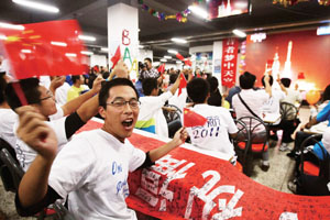 2011年9月29日晚,北航沙河校區學子在食堂觀看天宮一號發射升空直播