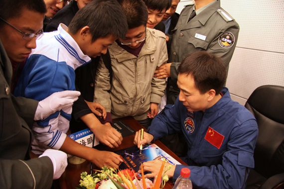 2012年10月,北航建校60周年慶典上,神舟九號的三位航天員景海鵬、劉旺、劉洋來到現場,他們分別表達了對北航60周年校慶的祝福,并向北航、向所有為中國航空航天事業做出貢獻的人們致敬